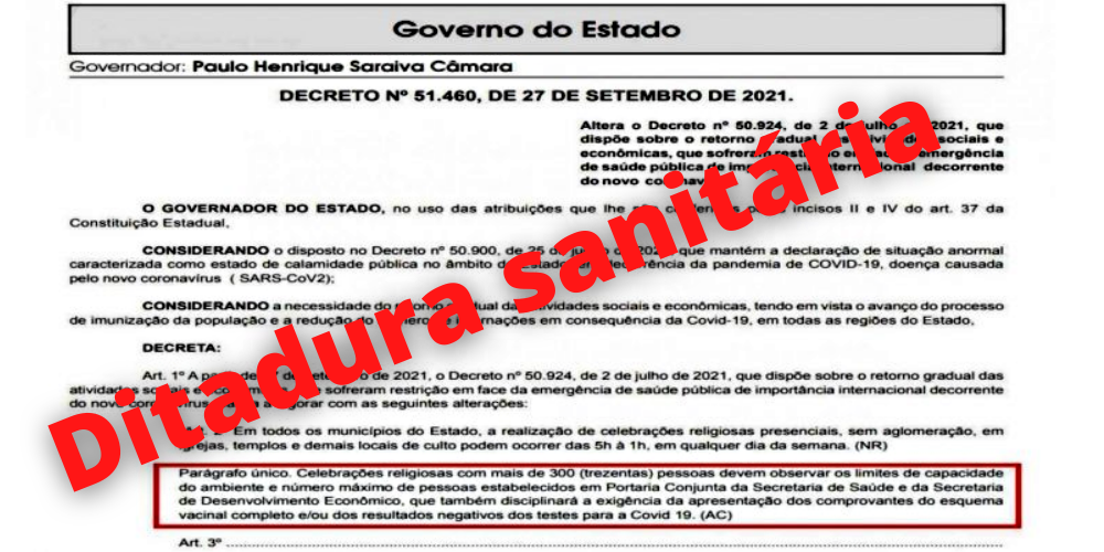 Continua o decreto: “Parágrafo único. Celebrações religiosas com mais de 300 (trezentas) pessoas devem observar os limites de capacidade do ambiente e número máximo de pessoas estabelecidos em Portaria Conjunta da Secretaria de Saúde e da Secretaria de Desenvolvimento Econômico, que também disciplinará a exigência da apresentação dos comprovantes do esquema vacinal completo e/ou dos resultados negativos dos testes para a Covid 19. (AC)”.