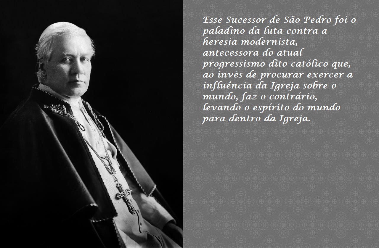 Sobretudo, esse Sucessor de São Pedro foi o paladino da luta contra a heresia modernista, antecessora do atual progressismo dito católico que, ao invés de procurar exercer a influência da Igreja sobre o mundo, faz o contrário, levando o espírito do mundo para dentro da Igreja.