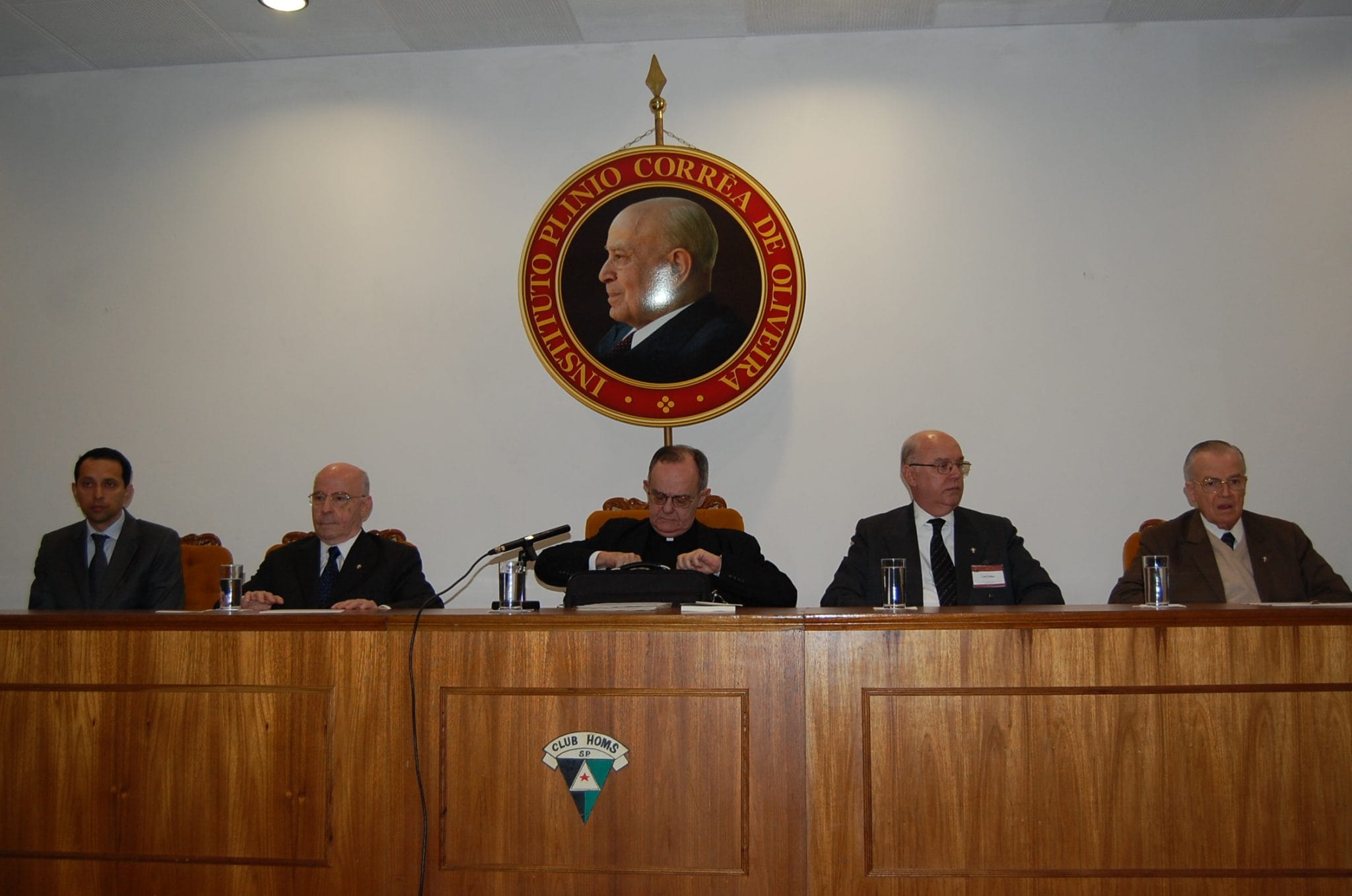 Dr. Plinio Xavier da Silveira abriu da conferência, em nome do Instituto Plinio Corrêa de Oliveira, e o Cel. Paes de Lira fez a apresentação do palestrante e do tema com a leitura do prefácio que escreveu para o livro de Mons. Sanahuja, lançado no evento: Poder global e religião universal.