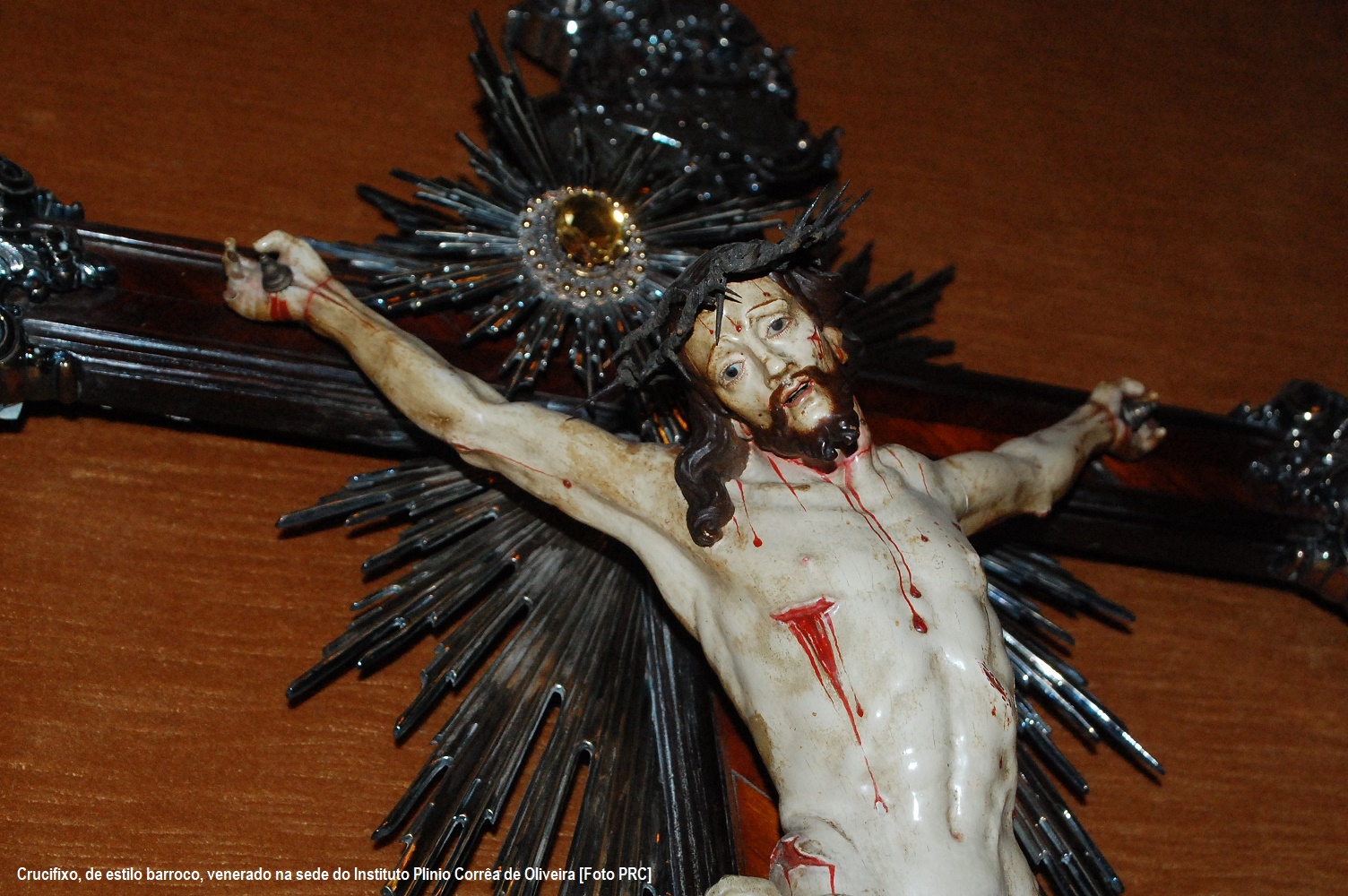 Mais do que física, o extremo da dor moral está expressa neste crucifixo de Nosso Senhor Jesus Cristo. Durante toda a sua Paixão, Ele padeceu um sofrimento maior na alma do que no corpo. Apesar disso, notamos em sua fisionomia paz, misericórdia, delicadeza de sentimentos. Nela o furor não está presente. Mas a tristeza está inteiramente presente.