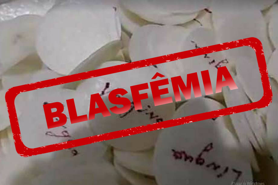 Como se não bastasse, uma das obras em exposição apresenta uma mala antiga cheia de hóstias, onde cada uma delas possui uma inscrição que lembra sangue, com palavras que não podemos reproduzir.