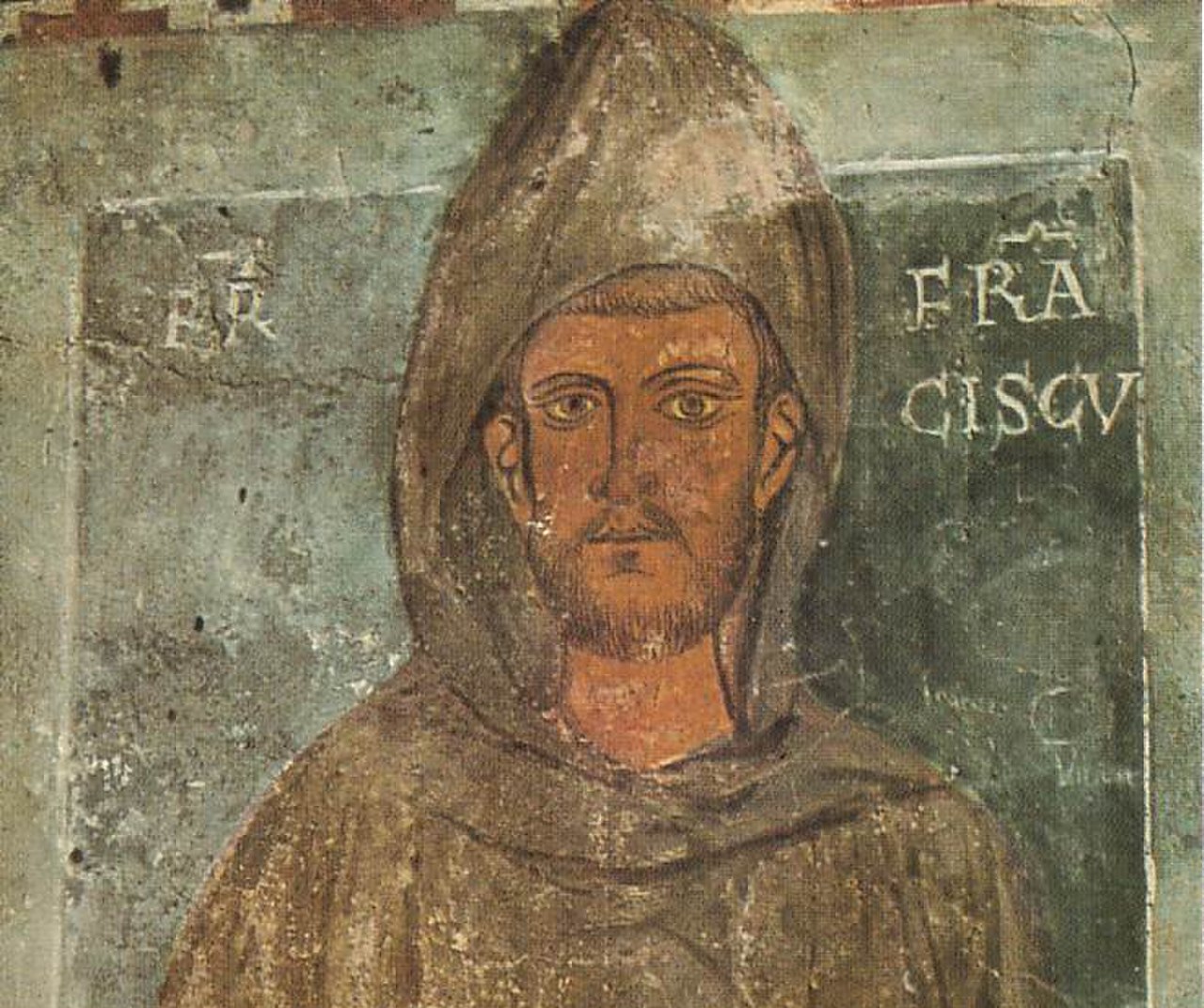 O mosteiro de Subiaco (Itália), construído a partir do século VI pelo próprio São Bento, é o berço da Ordem Beneditina. Em 1223, São Francisco de Assis o visitou. Esse afresco, de pintor anônimo do séc. XIII, é a representação mais antiga do ‘Poverello de Assis’ e fica na Capela de São Gregório na gruta de Subiaco. Pintado em vida do santo, antes de ele ter recebido os estigmas. Fisionomia bem diferente dos habituais ‘santinhos’ que conhecemos, normalmente distribuídos em igrejas, pintados segundo uma iconografia progressista, em que o santo parece sentimental, adocicado, hesitante e mole. O oposto das grandes virtudes de São Francisco de Assis, considerado uma das maiores glórias da Igreja em todos os tempos.