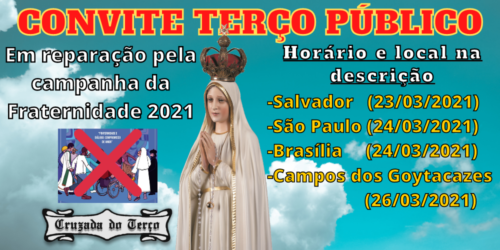 Terços públicos em reparação pelaCampanha da Fraternidade Salvador - BA Dia: 23/03/2021 (Terça-feira)Horário: 10hLocal: Largo Terreiro de Jesus, s/n - Pelourinho, Salvador - BA, 40020-210 São Paulo – SP Dia: 24/03/2021 (Quarta-feira)Horário: 10h30Local: Praça João Mendes (atrás da Catedral da Sé) Brasília – DF Dia: 24/03/2021Horário: 10h30Local: Praça dos…