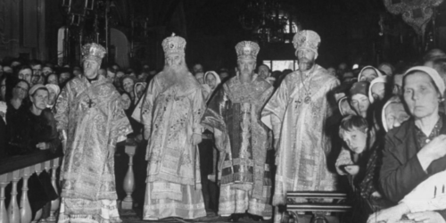 "Cena magnífica: rodeados por uma multidão de fiéis, quatro bispos da igreja russa dita ortodoxa se apresentam - por ocasião de uma cerimônia litúrgica - adornados pelo esplendor dos paramentos eclesiásticos do Oriente cristão. O quadro é próprio a incutir…