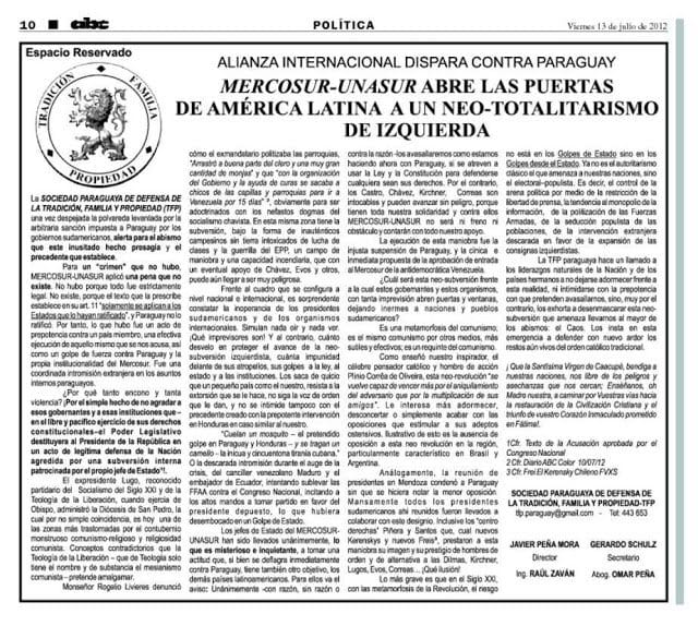 A SOCIEDADE PARAGUAIA DE DEFESA DA TRADIÇÃO, FAMÍLIA E PROPRIEDADE (TFP), uma vez desfeita a poeira levantada pela arbitrária sanção imposta ao Paraguai pelos governos sul-americanos, alerta para o abismo que este inusitado fato pressagia e o precedente que estabelece.