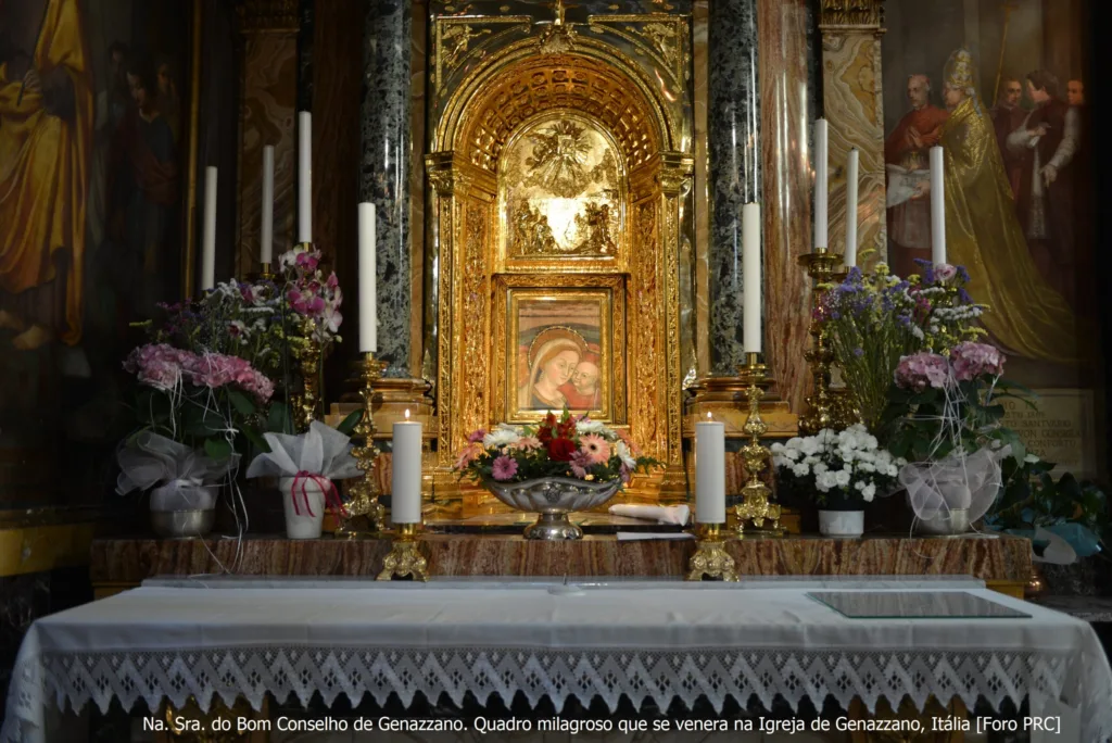 No século XV, o quadro d´Ela [foto] foi trasladado miraculosamente pelos anjos, da Albânia invadida pelos muçulmanos para cidade de Genazzano, nas proximidades de Roma. Seu quadro operou numerosos milagres, favorecendo pessoas que rezavam diante dele, e incontáveis pessoas alcançaram receberam grandes graças.